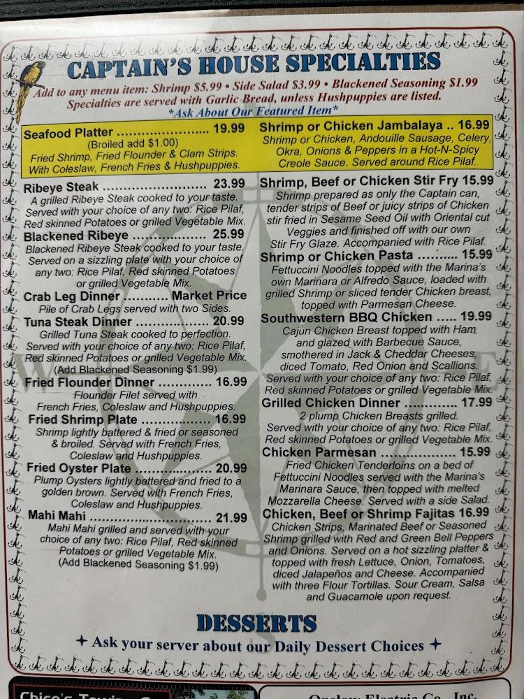 The menu at Capt. Bob Beck's reflects casual American dining. Popular starters include New England clam chowder and nachos. The burgers are well-loved, especially the Anchor Burger and Chilli Cheese Burger. Seafood lovers have a variety of choices, from crab legs to a mixed seafood platter.